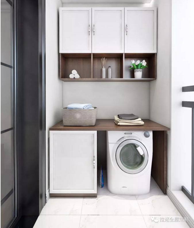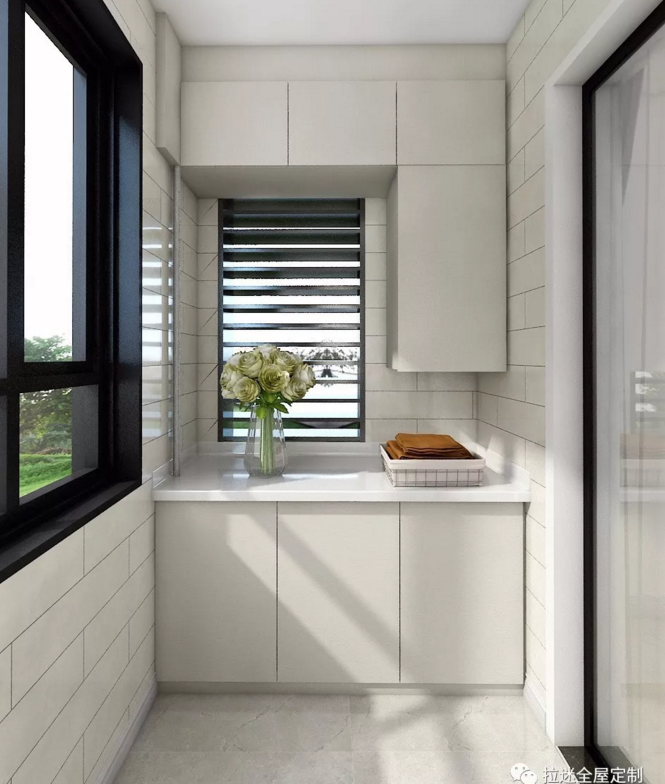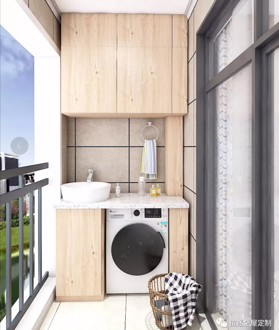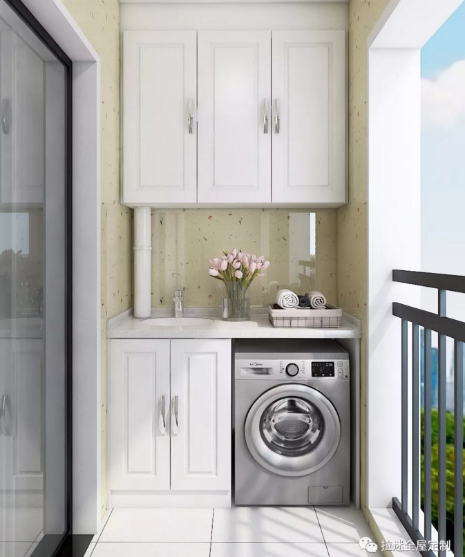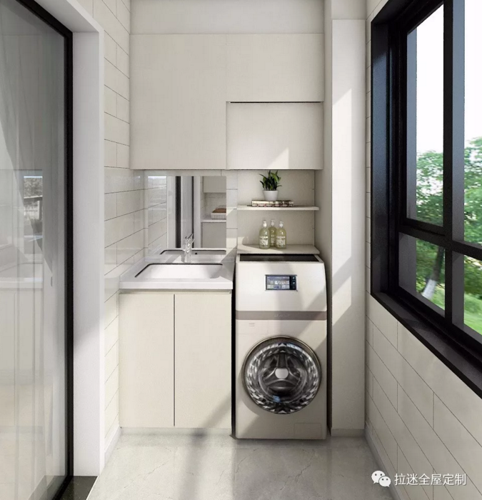 除了安放洗衣机和洗手盘,把阳台变成一个洗衣房和洗漱区之外,阳台的另一个作用就是安装收纳柜。