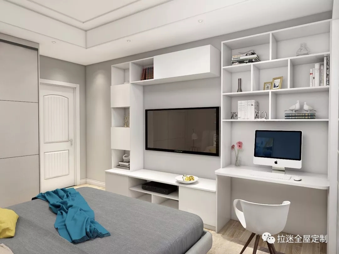 很多时候,在卧室里安装电视柜是正对着床头的。这个时候,如果仅仅安装单个电视柜,就会显得突兀。而在旁边搭配一个梳妆台或者书桌时,不仅大大加强实用性和收纳空间,而且也能展示出卧室装修的整体性。