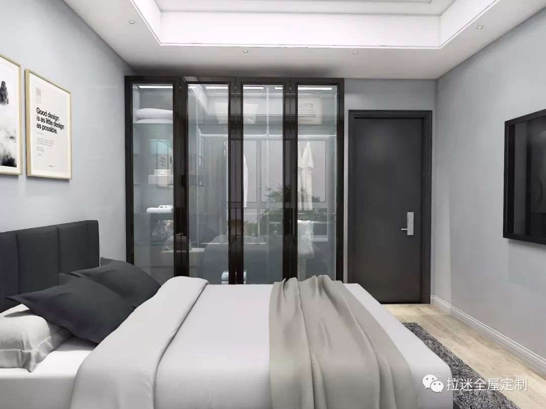 两个卧室采用了不同的衣柜设计。一个以封闭式为主,另一个则是开放式为主,还加入了电视柜。