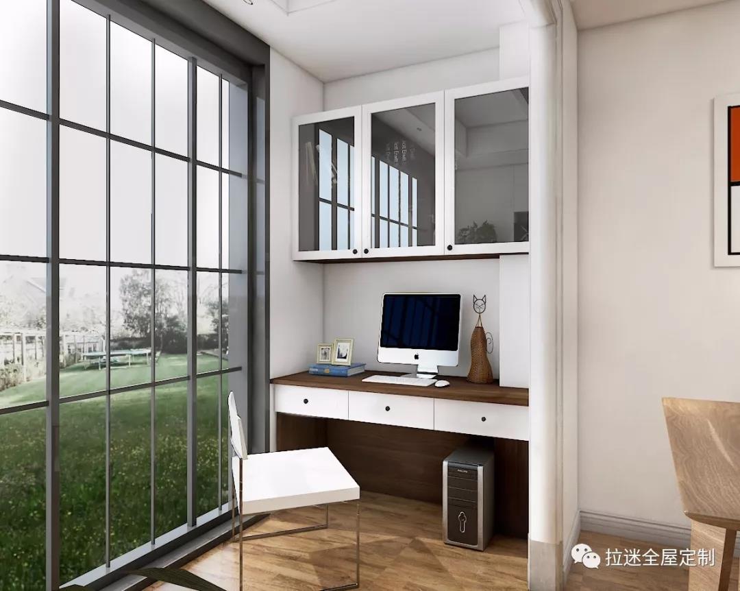 阳台视野宽阔、光线充足,是个非常好的办公、休息、娱乐的场所。在阳台设计一处学习办公一体柜,借着良好的自然采光,物尽其用。看着风景,办公学习的效率会提高不少。