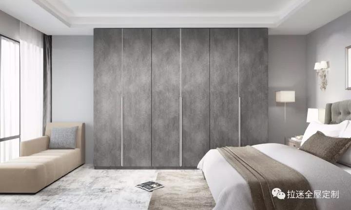 如果你的卧室空间希望风格更加统一,那么衣柜、书柜等都可以统一定制,甚至在衣柜上融入电视背景墙的元素。