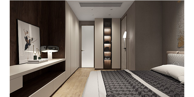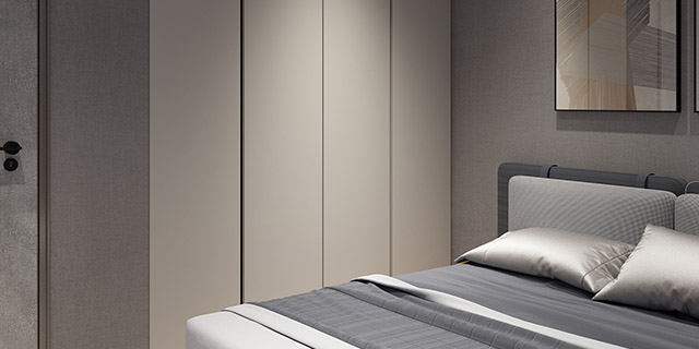 次卧主要柜体是一个沙漠灰的顶天立地衣柜,