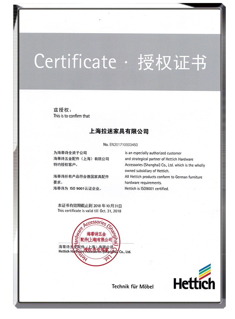 拉迷全屋定制选择源自欧洲的三大五金品牌——奥地利BLUM、德国HETTICH和奥地利GRASS,让用户体验到纯正的德国品质。
